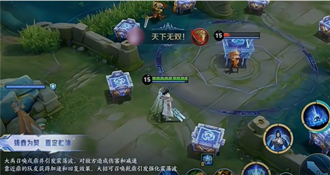 戊鼎本身可以带给友方一个持续治疗的效果,并且期间有15秒的冷却,冷却期间治疗量并不随着时间衰减,当大禹站在鼎上的时候,可以获得短暂的霸体效果,这个效果不能被打破,除非大禹主动攻击敌人,小编个人觉得,这个霸体效果在战场中格外重要,也是戊鼎除了加血,增速,最核心的功能之一。