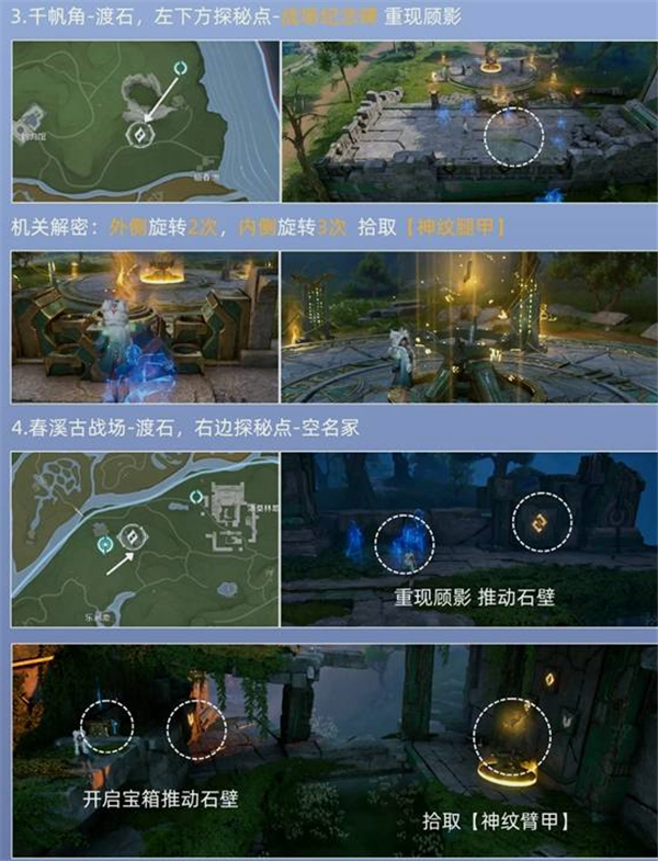 按图片展示,重现顾影,推动石壁,开启宝箱推动石壁,拾取神纹臂甲