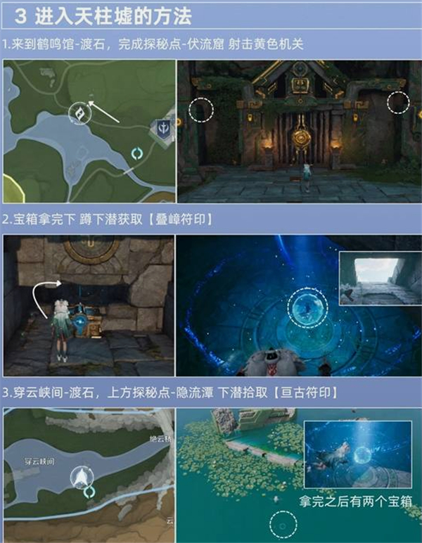 宝箱拿下后,蹲下浅获取层叠嶂符印,穿云峡间-渡石,上方探秘点,隐流潭,下潜获取亘古符印,其中有两个宝箱