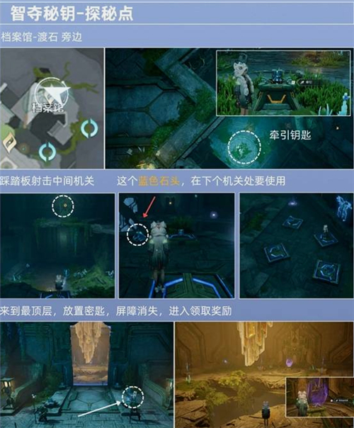 随后踩踏板射击中间机关,按照图示上面,找到这个蓝色石头,在下个机关处要使用
