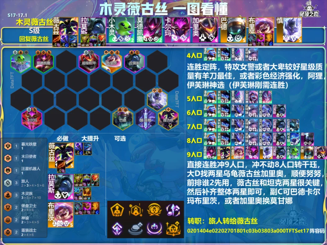 总结:这套阵容的运营思路是稳健运营,快速上9。前期用“未来+海魔”体系快速积累经济,中期用4重装稳血,后期靠5费两星的质量碾压吃鸡。可以根据你的来牌和装备,在上述变阵中灵活选择。希望对各位玩家有所帮助。