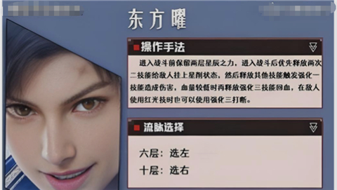根据游戏官方的设定,每个英雄都要选择战斗流派,战斗流派是指英雄的成长走向,比如暴击流,输出流,连击流,续航流等流派,而小编的东方曜走的就是输出流,这个流派要求第六层的时候,选择左侧分支,直接强化技能,连招的基础伤害值,并且提升技能的流畅度,非常适合新老玩家们在前期发育的时候使用。