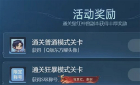 而猩红神兽的技能也十分强大,需要注意当它释放红光技能的时候迅速闪避,当做出完美闪避动作后,可以强化一次普攻,打出超乎想象的伤害,猩红神兽另一个大招陨石,将会对玩家造成眩晕,因此要注意操作技巧和走位,避免被boss技能眩晕到,尽可能在最短时间内完成战斗,才可以顺利领取任务奖励,获得限定称号。