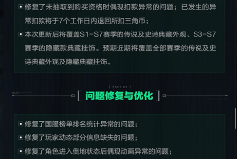 最后,更新还修复了国服榜单排名统计问题,修复玩家角色动态信息的丢失问题,以及角色倒地之后动画异常的情况。
