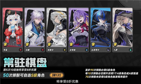 通过常驻棋盘玩法,前5次10连抽可以获得最多8折优惠,每投掷50次可以获得S级别角色奖励,至多90次掷股必得S级角色