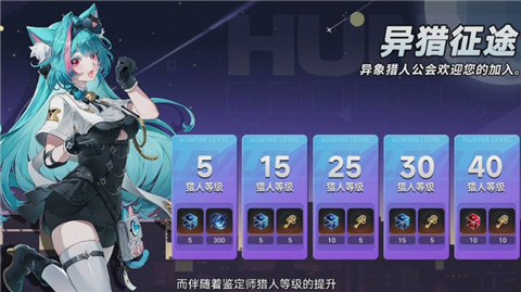 异猎征途玩法,异象猎人公会等待玩家们加入,提升猎人等级,可以获得珍惜的奖励。