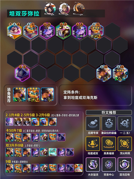 2-1阶段:拿到“坦度成双”,阵容直接成立。如果2-1没拿到,也可以在3-2拿到后再考虑,但那时要看装备和来牌是否合适,风险会高一些。