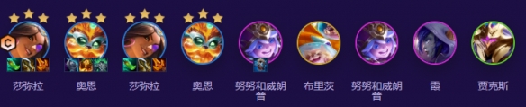 中期启动 (3-5 ~ 4-1):升级到7级,开始D牌。目标是找到两个2星的莎弥拉和两个2星的奥恩。随后卡着50块钱的利息,慢慢追出莎弥拉和奥恩的双三星。这套阵容里的莎弥拉几乎没人抢,很容易三星。