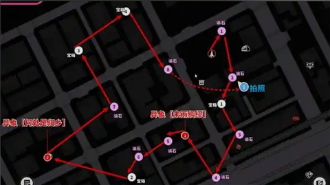 绘空町,核心隐藏区域,重点清理小巷,高台隐蔽谕石,完成特殊异象委托,全程按照触发条件执行,确保21赠礼和打卡点全收。