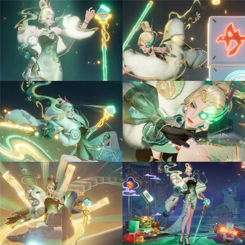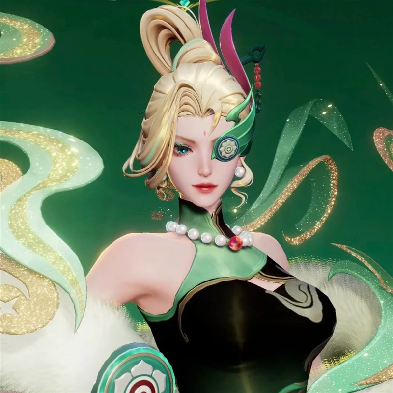 人物造型:米莱狄身着青白玉色的典雅旗袍,其上有精致的青花瓷纹理与象征财富的金钱纹,标志性的眼罩上则绘有“幺鸡”图案,尽显华贵。