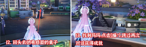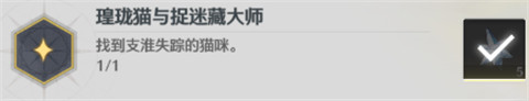 接取「寻猫大师」任务后,跟随蓝色光标指引,从二楼跳至一楼(或乘坐扶梯下楼),在一楼角落找到NPC“隧群爱好者”,点击对话。在与隧群爱好者对话完成后,前往拉贝尔学部大厅中央,找到NPC“跳舞的学生”(位于前台附近),靠近后选择对话选项“喵”,完成交互。最后,朝着小地图东南方向前进,找到NPC“纳希”,在纳希身后的桌子上可看到猫咪玛玛,再次点击与玛玛对话。对话完成后,立即弹出「瑝珑猫与捉迷藏大师」成就解锁提示,成就解锁完成。
