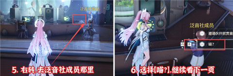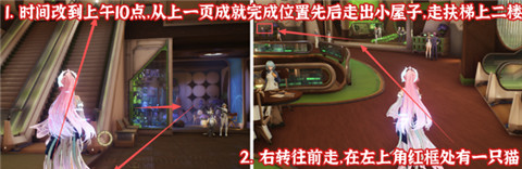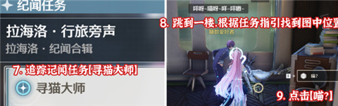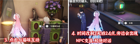 调整好时间后,返回猫咪玛玛所在位置,视角后转,找到NPC“支淮”(位于猫咪附近,标识清晰),点击对话,完成交互。与支淮对话完成后,朝着小地图南方向前进,找到NPC“泛音社成员”,靠近后会出现对话选项,选择“喵?”。选择正确选项后,会自动接取纪闻任务「寻猫大师」,任务会出现蓝色光标指引,跟随指引即可完成后续步骤。