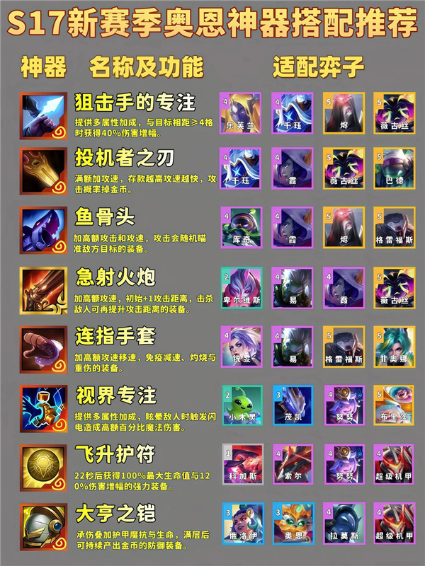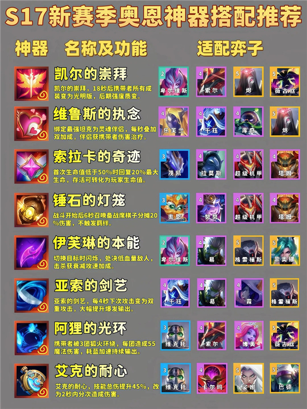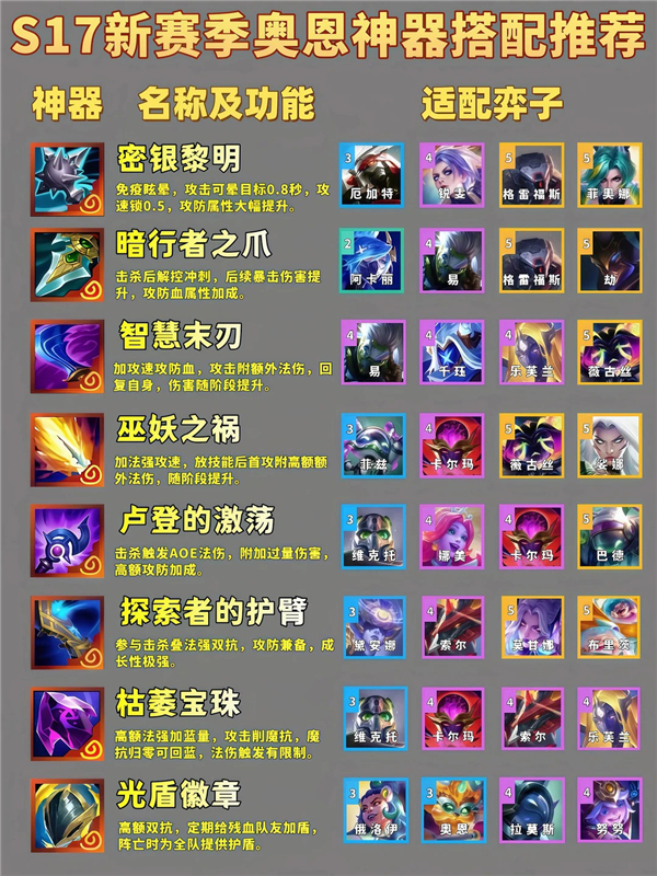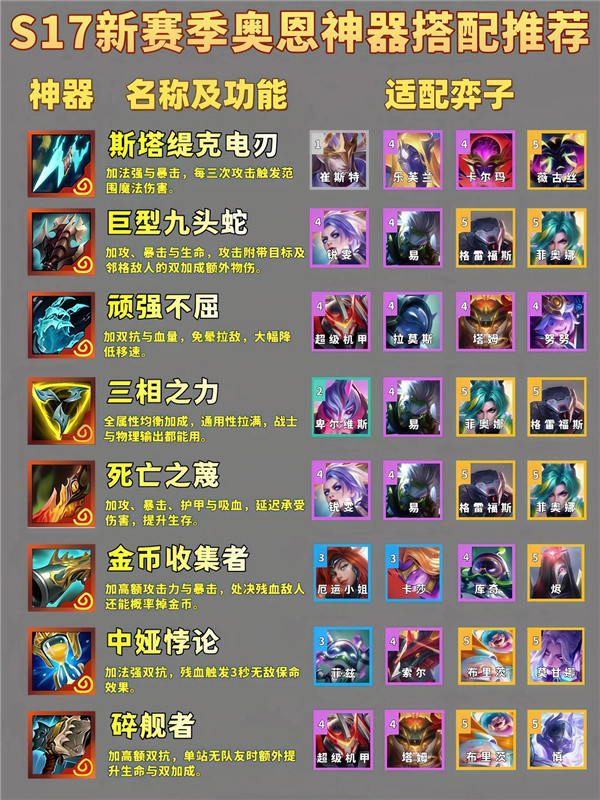 金铲铲之战S17神器适配哪些英雄? 在当前的这个星神版本中,装备是构筑阵容的核心,每位英雄都有自己适配的武器装备,特别是神器装备,这一类神器武器是特殊且稀有的装备。不仅自带独一无二的强大效果,而且强度远超普通装备,而这些神器也是有对应的角色英雄的,只要选对装备,阵容的强度能立刻上一个台阶。以下为你整理了一份详细的神器适配推荐。还不清楚的玩家可以参加看看。
