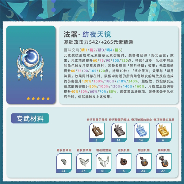 主属性为元素精通,技能可提升全队绽放伤害,突破材料需「霜夜灵」「巡陆艇掉落物」等。