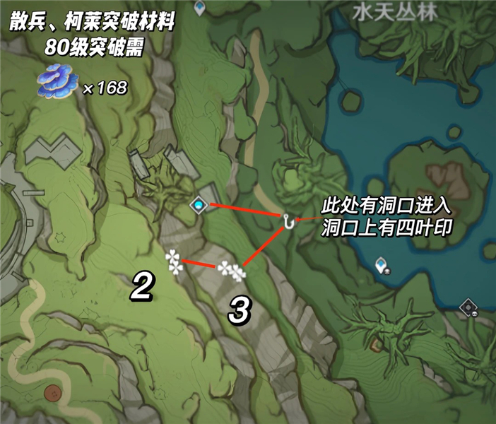 1、从五角星标记处进入地下,树根处分布4朵,需注意路径隐蔽。