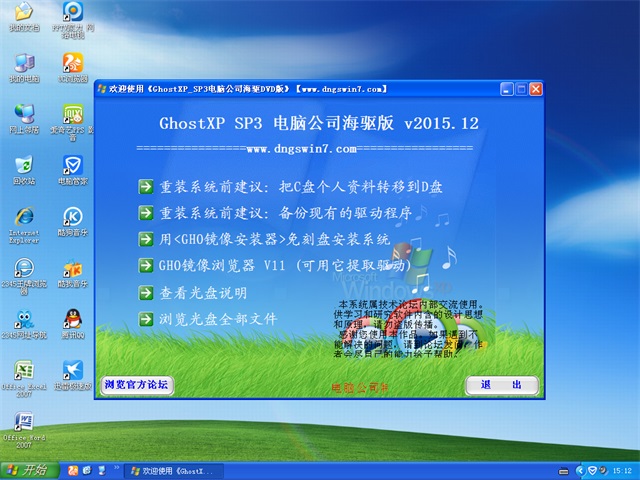 * 源安装盘采用Windows XP SP3官方免激活版,集成系统补丁至2015.11(可通过微软漏洞扫描)