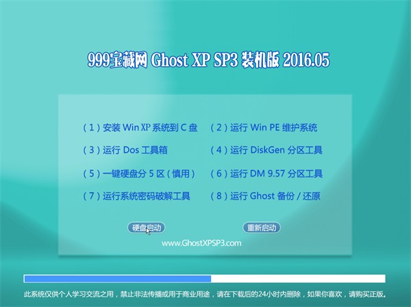 999宝藏网 GHOST XP SP3 装机版 2016.05系统,999宝藏网具有安全、快速、稳定等特点。本系统可以一键无人值守安装、自动识别硬件并安装驱动程序,999宝藏网大大缩短了装机时间。本系统恢复速度更快,效率高!系统集成了多款常用软件,999宝藏网更适合电脑维护人员快速装机之用。系统用 GHOST XP SP3 原版制作,999宝藏网集成了最新的安全补丁和其它系统升级程序,999宝藏网可以通过微软正版验证,999宝藏网支持在线更新。