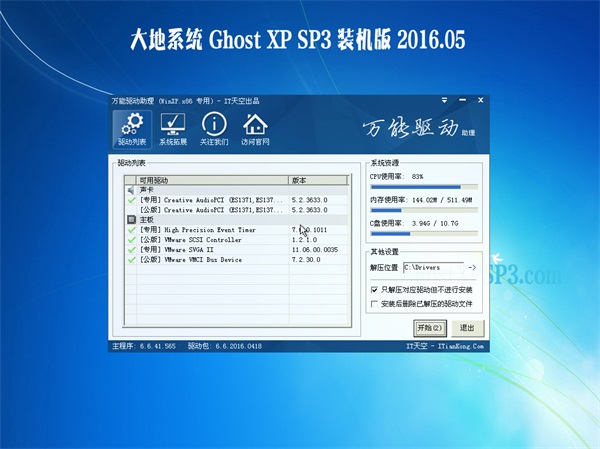大地系统 GHOST XP SP3 装机版 2016.05系统,大地系统具有安全、快速、稳定等特点。本系统可以一键无人值守安装、自动识别硬件并安装驱动程序,大地系统大大缩短了装机时间。本系统恢复速度更快,效率高!系统集成了多款常用软件,大地系统更适合电脑维护人员快速装机之用。系统用 GHOST XP SP3 原版制作,大地系统集成了最新的安全补丁和其它系统升级程序,大地系统可以通过微软正版验证,大地系统支持在线更新。